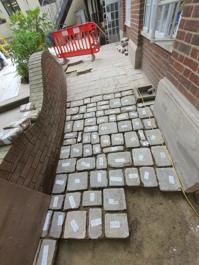At the start of the project the cobbles in the garden were all taken up, marked on a plan and numbered and now they are